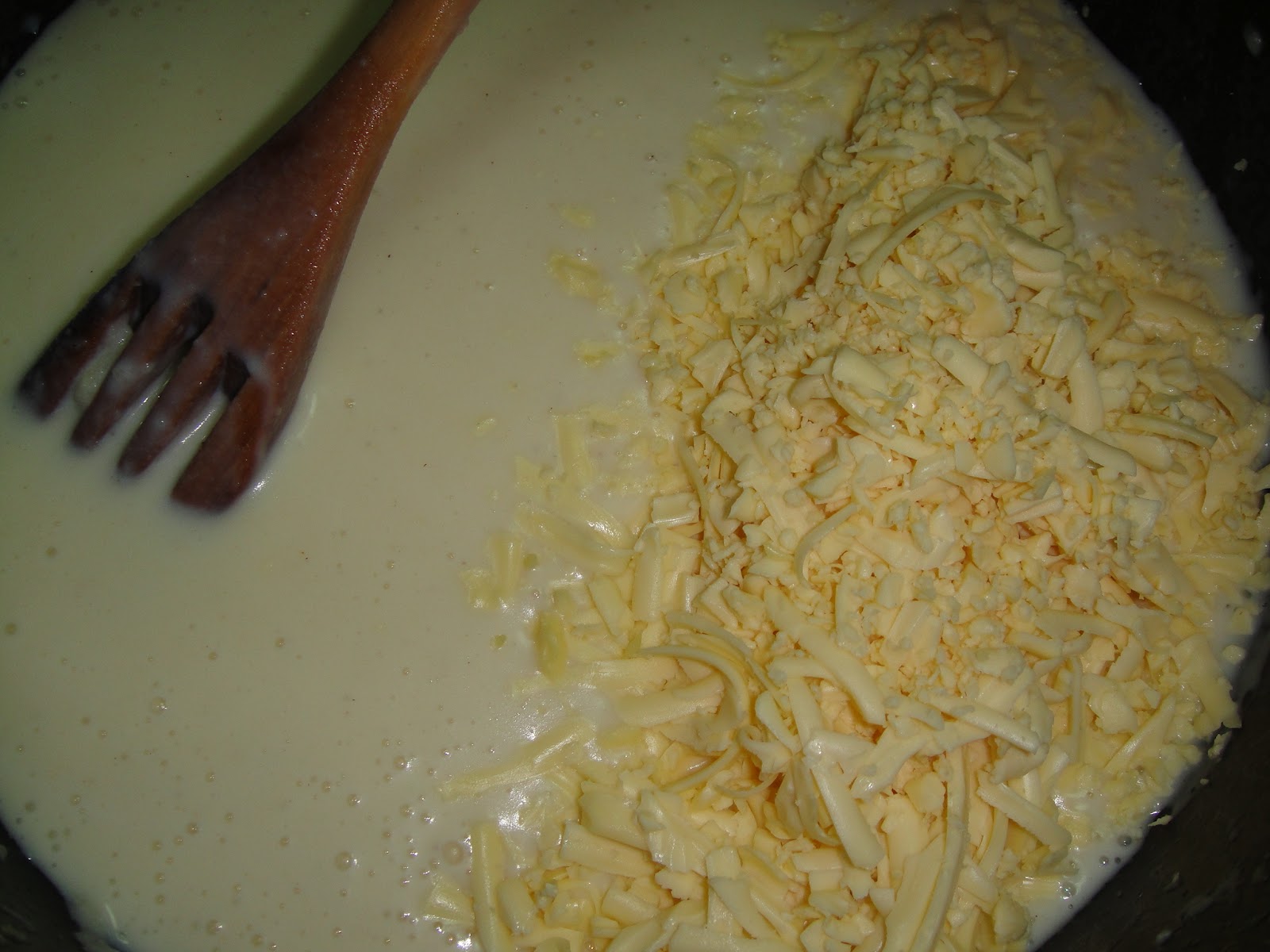Whisk in the milk and bring to a simmer, stirring continuously.