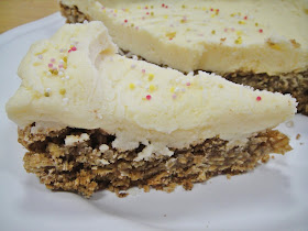 Chewy oat cookies are some of my favorites. I have a couple of reciepes here on MCW, and honestly cannot pinpoint my favorite. There is the one with raisins, another with M&M's... and now this giant oat cookie, served as a pie, swerved with a thick layer of butter frosting.